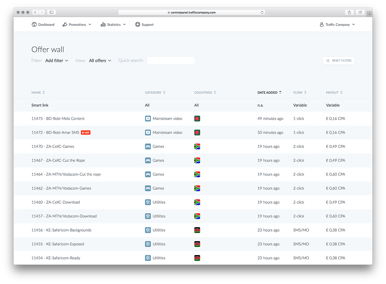 As explained in Static Links v.s. Smart Links some people prefer promoting single offers. That's why Traffic Company has recently launched a new feature called the Offer Wall, built especially for all promoters that want to take full control of their promotions.